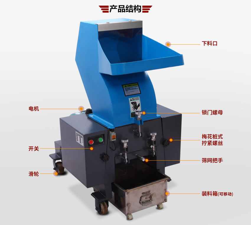 本机适用于硬骨头、、化工材料、硬度较低的矿石以及聚苯乙烯、聚丙烯、尼龙、工程塑料和泡沫软料的废、次品或注射喷头等破碎之用。